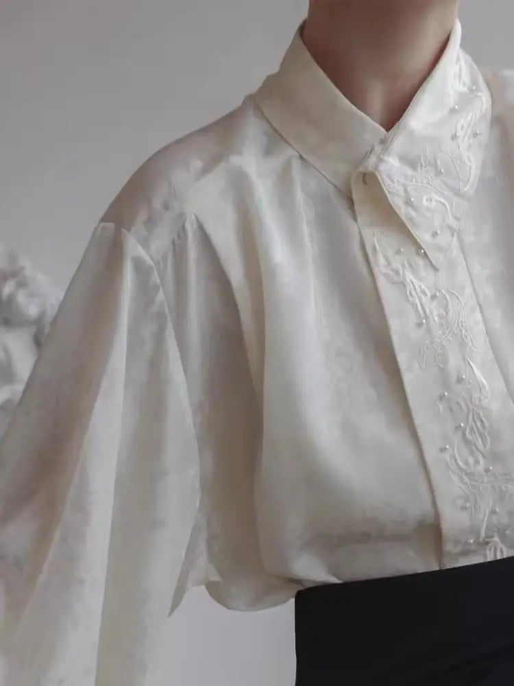 Chinese Style Women's Shirts Vintage Embroidered Blouse Heavy Industry Long Sleeve White Shirt Elegant Ladies Clothes Tops 2024