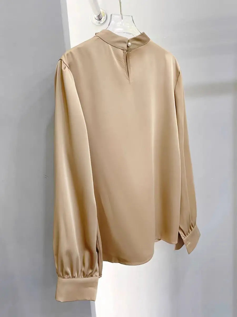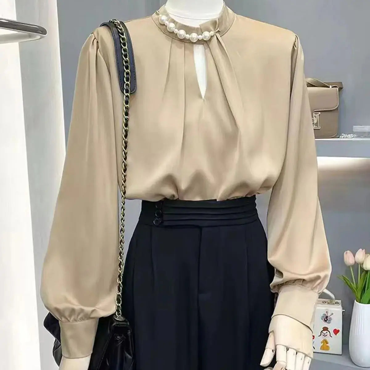 Hollow Out Stand Collar Shirts Blouses Pearl Blusas Long Sleeve Elegant Women Clothes French Style Office Ladies Wear Trendy